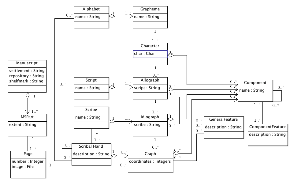 [Edit, 17 October 2011: The UML diagram has been altered from the original by associating Script, Scribe and Hand directly with Component as a way of capturing elements of style which are common across multiple characters.]