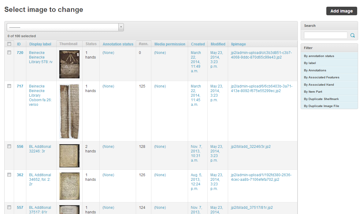 The screen shot above is the Change List for the Image table. This view shows a grid where each column heading is the name of a field, each line represents a record in the selected table and each cell is the value the record take for that field. The total number of records in the table is displayed at the bottom of the page. DigiPal only shows 100 records per page so you have to use the navigation bar to browse through subsequent pages.