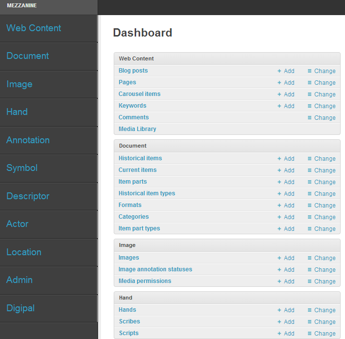 The DigiPal framework stores all your information in a relational database (more on this later) and offers a visual environment to edit its content. This environment is called the 'admin interface'. It is basic but user-friendly and its main quality is to be entirely web based. This means that: