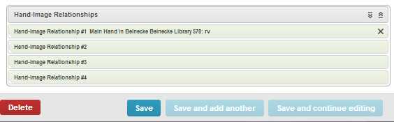 The last sections of the forms often contain expandable links to related records. This usually happens when the current record can have more than one connection to other record types. The above screen shot shows the bottom of the Image form we saw earlier. It is a list of connections between the current Folio Image and the Hands which wrote on that folio. There is only one hand defined here: the 'Main hand'. Clicking this hand entry will show a form to edit the record or a drop down to select the related Hand record. You can remove the connection by clicking the cross near the right border. If you want to define one more hand just click on the second entry called 'Hand-Image Relationship #2' and select a Hand in the drop down. You can also click the plus sign as explained above to add the hand record if it not yet in the database.