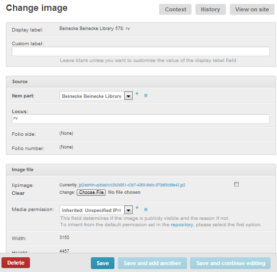 - drop downs is used for foreign keys to other records. In the above screen shot we see that the image record relates to the Item Part 'Beinecke Library 578'. There are two small blue icons on the right hand side of each drop down,: