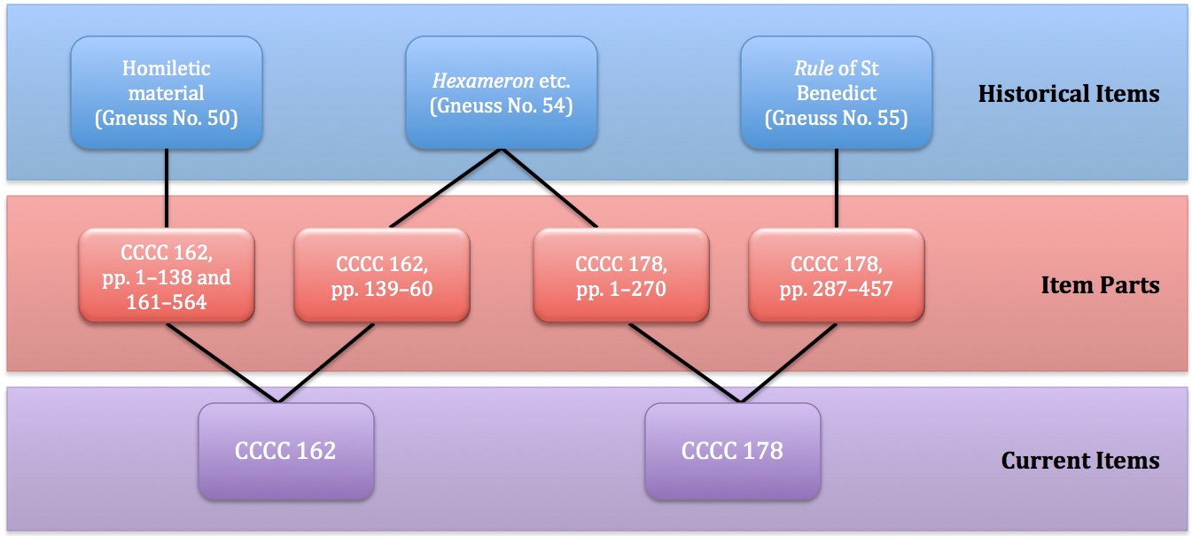 A more complex example is Cambridge, Corpus Christi College MSS 162 and 178. Originally there were three manuscripts: one book of homilies and related material (Gneuss No. 50), a manuscript containing Ælfric's Hexameron and other works (Gneuss no. 54), and a bilingual Rule of St Benedict (Gneuss No. 55). These three are therefore Historical Items. However, the second of the three was split into two parts. One part was bound with the bilingual Rule, and the other part was inserted into the middle of the homiletic volume. We therefore have two volumes today, CCCC 162 and CCCC 178. These are both Current Items, insofar as they each form distinct volumes and can be request as such from the library today. There are also four distinct codicological units – the homiletic volume, the Rule, and the two parts of the Hexameron – and these in turn correspond to Item Parts. In summary, then, there are: