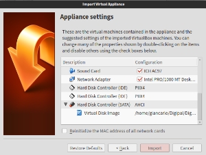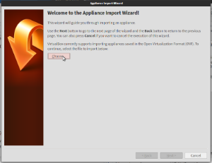 The first thing you need to do is running VirtualBox. Afterwards, from the menu, go to File->Import Appliance. The window will prompt you to choose the file you want to load: that is the file downloaded in the previous step. Afterwards, click the button "Import".